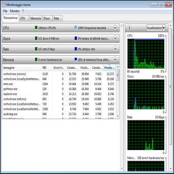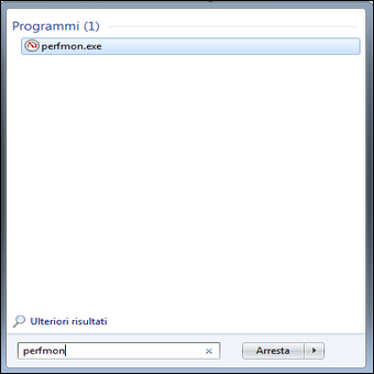 | 1. Per avviare il tool di Windows 7 Monitoraggio affidabilità e Performance monitor clicchiamo sul pulsante Start. Nel box di ricerca digitiamo la voce perfmon e selezioniamo Perfomn.exe. Quando compare la finestra Controllo dell’account utente clicchiamo sul pulsante Continua per aprire la finestra del tool. | 2. Nella finestra che compare, possiamo visualizzare una serie di indicatori che mostrano in tempo lo stato reale del sistema. Clicchiamo al centro su Apri Monitoraggio Risorse: espandendo ad esempio la sezione Memoria possiamo controllarne la quantità occupata da ogni processo. | |