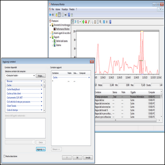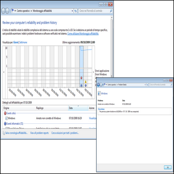 | 3. Per visualizzare il grafico delle prestazioni del computer, clicchiamo nel pannello di sinistra su Strumenti di monitoraggio/Performance Monitor. Per monitorare anche altri parametri del PC, clicchiamo in alto sul tasto verde +, selezioniamo una voce dall’elenco, ad esempio Cache, clicchiamo su Aggiungi, quindi su OK. | 4. Clicchiamo adesso a sinistra sulla voce Strumenti di monitoraggio/Azioni/Visualizza Affidabilità di Sistema: in questo modo potremo visualizzare nell’area di destra una timeline che riporta tutti gli eventi e gli errori salienti occorsi al sistema operativo. Per verificare gli eventi accaduti in una data specifica, utilizziamo il menu in alto a sinistra Visualizza per: Giorni/Settimana. | |