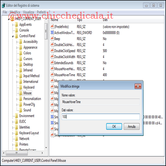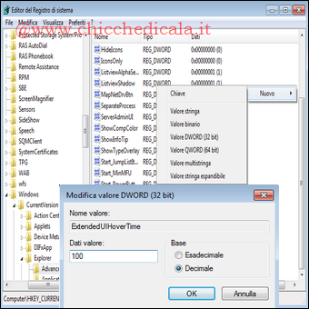 | 1. Clicchiamo sul pulsante Start/Esegui e digitiamo Regedit/Invio. 2. Portiamoci sulla chiave HKEY_CURRENT_USER\Software\Microsoft\Windows\CurrentVersion\Explorer\Advanced. 3. Clicchiamo col tasto destro su una parte vuota, selezioniamo Nuovo/Valore DWORD denominandolo “ExtendedUIHoverTime“. 4. Clic destro sulla chiave appena creata, selezioniamo Modifica, impostiamo il valore Base in Decimale e nella sezione Dati Valore assegnamo 100, in questo modo il ritardo sarà di 100 millesecondi. 5. Terminata l’operazione riavviamo il sistema per rendere effettive le modifiche. In alternativa, è possibile personalizzare il tempo globale di hover del sistema, che regolerà il ritardo per tutto il sistema, comprese le icone della barra delle applicazioni, i collegamenti del menu Start, etc: 1. Clicchiamo sul pulsante Start e digitiamo Regedit/Invio. 2. Portiamoci sulla chiave HKEY_CURRENT_USER\Control Panel\Mouse. 3. clic destro sulla chiave MouseHoverTime e selezioniamo Modifica. 4. Impostiamo il nuovo valore a 100. Il valore predefinito è 400 millisecondi. 5. una volta modificato, clic su OK e riavviamo il sistema. | ||