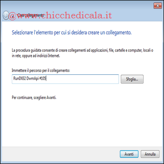 • Tasto destro del mouse sul desktop e selezionate Nuovo, quindi Collegamento. Immettiamo il percorso per il collegamento: RunDll32 DwmApi #105 e clicchiamo Avanti.