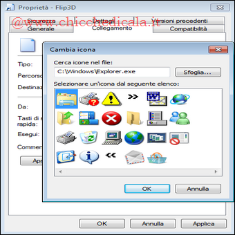• Modifichiamo L’aspetto del nostro collegamento con un icona più indicata. Clic destro Proprietà/Cambia Icona e immettiamo il percorso C:\Windows\Explorer.exe seguito da Invio e selezioniamo l’icona desiderata.