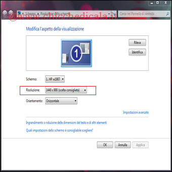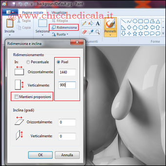 | 3. Ora dovremo controllare la risoluzione del nostro schermo, clicchiamo col tasto destro del mouse su un punto vuoto del desktop e selezioniamo la voce Risoluzione dello Schermo (esempio: 1440×900), prendiamo nota della risoluzione e chiudiamo la finestra. 4. Apriamo l’immagine backgroundDefault.jpg con Paint e Clicchiamo su Ridimensiona. Nella sezione IN: selezioniamo Pixel e togliamo il segno di spunta da Mantieni Proporzioni, a questo punto ridimensioniamo l’immagine con gli stessi valori della risoluzione dello schermo (esempio: 1440×900). | ||