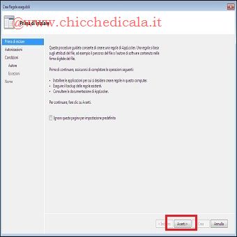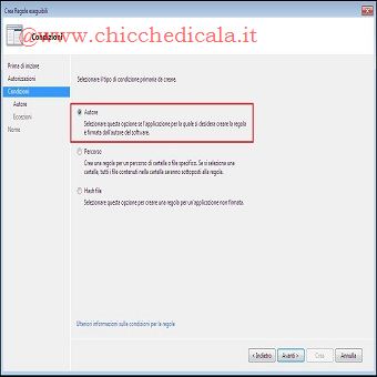 | 4. Nella pagina Prima di iniziare clicchiamo su Avanti. 5. clicchiamo su Consenti o su Nega per consentire o negare i file inclusi nella regola. 6. Facciamo clic su Seleziona. Nella finestra di dialogo Seleziona gruppo o utente digitiamo il nome dell’utente o del gruppo e quindi clicchiamo su OK, oppure clicchiamo su Avanzate/Trova e selezioniamo l’utente desiderato, quindi Avanti. 7. clicchiamo sulla condizione appropriata per questa regola. È possibile scegliere tra Autore, Percorso o Hash file, e quindi proseguiamo con Avanti. NOTA: A SECONDA DELLA CONDIZIONE SELEZIONATA PER LA REGOLA, VENGONO RICHIESTI DIVERSI CRITERI