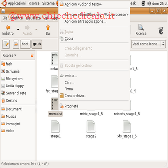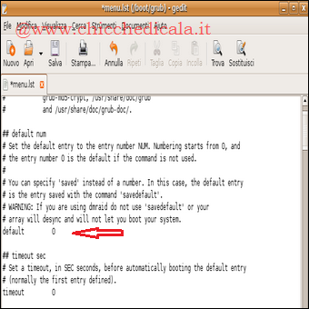 | 1. Apriamo, con i privilegi di root, il file /boot/grub/menu.lst in un editor di testo e cerchiamo la righa: Timeout= 10 (o 3). Quando l’abbiamo trovata possiamo ridurre il valore indicato oppure, impostandolo a 0, eliminare del tutto l’attesa. In questo caso, con sistemi dual-boot, parte immediatamente il sistema impostato come default. Dovremo premere ESC per far comparire il menù di Grub. | ||