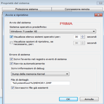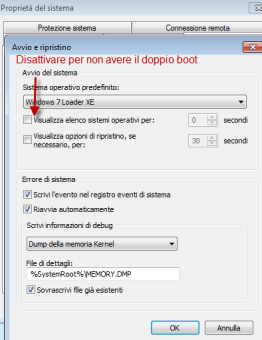 | 5. Il sistema mostra una spunta su visualizza elenco sistemi \t\toperativi per 30 secondi | 6. Eliminare la spunta e cliccare OK per rendere automatico il boot \t\tdi Windows 7 | |