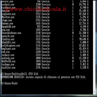| 1. Avviamo il prompt dei comandi digitando cmd nella barra di ricerca del menu Start e premiamo Invio, lanciamo il comando tasklist per ottenere una lista di tutte le applicazioni in esecuzione. 2. si potrebbe Killare il processo utilizzando la colonna nome immagine, ma potrebbero insorgere dubbi per la presenza di due voci analoghe (con lo stesso nome), proprio per questo focalizzando la nostra attenzione nella colonna PID (Process ID), noteremo che ogni applicazione/processo a un numero PID diverso, rendendo più facile e sicura la decisione. 3. Detto questo possiamo cominciare a prendere provvedimenti. digitiamo taskkill /PID 3116 seguito da INVIO ( dove 3116 sta come esempio), fatto questo, avremo terminato il processo biricchino!!!! | ||