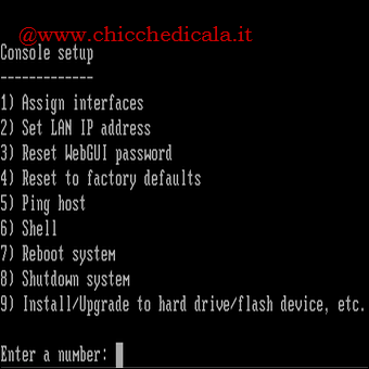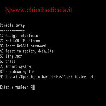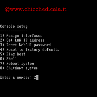| 14. FreeNAS si caricherà nuovamente, questa volta dal disco rigido. Premiamo Invio per accedere alla console di Seput. | 15. Assicuriamoci che il computer sia connesso alla rete/net e digitiamo il numero 2 seguito da Invio per impostare l’indirizzo IP LAN. | |