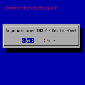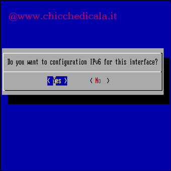| 16. Apparirà una finestra di dialogo chiedendoci se desideriamo utilizzare l’interfaccia DHCP, confermiamo con Yes per proseguire. | 17. Un altra finestra ci chiederà se desideriamo utilizzare l’ autoconfigurazione di IPv6, ancora una volta confermiamo con Yes. | |