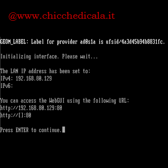 | 18. Qualche istante per impostare il vostro indirizzo IP LAN e alla fine ci restituirà una schermata tipo questa. Premiamo Invio per continuare e tornare alla schermata della console di Seput. | 19. Congratulazioni! Abbiamo configurato la l’ installazione iniziale di FreeNAS, a breve pubblicheremo la prossima Guida. (configurazione di base attraverso la Web GUI). | |