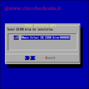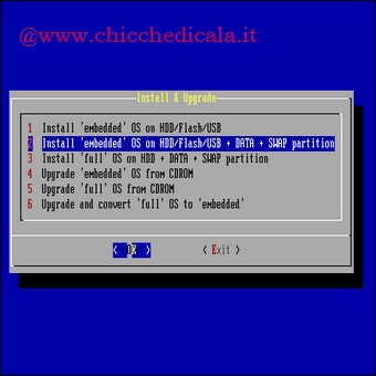 | 5. Si presenteranno varie opzioni di scelta, ma la cosa migliore da fare è selezionare “Install ‘embedded’ OS on HD/Flash/USB + Data + Swap”. questa utilizza meno spazio, e si ha maggior volume sul disco rigido per i file. Una volta selezionato, premiamo OK. | 7. Apparirà il menù che vediamo in figura, chiedendoci di scegliere l’unità CD-ROM per l’installazione, se abbiamo solo un disco poi, la scelta è ovvia. Premiamo OK per proseguire. | |
