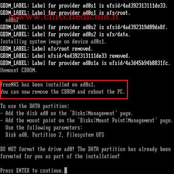 NB: Nei casi in cui FreeNAS venga installato su un drive USB, CF o su Hard Disk, il CD Rom di installazione deve essere rimosso non appena terminata l’installazione di FreeNAS. Ulteriori Informazioni. | ||