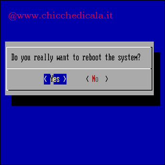 | 12. Digitiamo il numero 7 e premiamo Invio per riavviare il sistema. | 13. Confermiamo il riavvio, e allo splash screen ricordiamoci di estrarre il CD utilizzato per l’installazione. | |