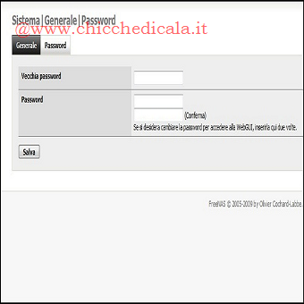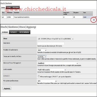 | 6. Spostiamoci nel Tab Password, in modo da cambiare quella di Default (freenas) con una personale, digitiamo la vecchia password e quella nuova confermando le modifiche cliccando su Salva. (nel caso apparisse nuovamente la finestra di Login, inseriamo nuovamente le nostre credenziali per continuare) 7. Dalla Barra Multifunzione spostiamoci in Dischi/Gestione e cliccando sul tasto + . Nel campo Disco selezioniamo il disco rigido in cui è installato FreeNas e configuriamo la modalità di trasferimento, il tempo di StandBy e nel campo File System selezioniamo UFS, ( file System utilizzato da FreeNas) confermiamo cliccando su Aggiungi. | ||