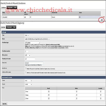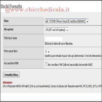 | 8. Dalla Barra Multifunzione, spostiamoci nella sezione Dischi/Formatta, se abbiamo più di un disco rigido nel sistema sarà necessario formattarlo nel formato corretto UFS. (È possibile saltare questo passaggio se disponiamo di un solo hard disk). Nel campo disco, selezioniamo il disco rigido che si desidera formattare (Ovviamente quello in cui abbiamo installato FreeNas). Nel campo file system scegliamo UFS (GPT e Soft Updates), mentre nel campo etichetta di volume inseriamo un nome a piacere, \t\tlasciamo tutto il resto con le impostazioni predefinite e premiamo il pulsante Formattta il Disco. 9. Successivamente, avremo bisogno di creare un punto di mount per il discho, Nella Barra Multifunzione clicchiamo su Dischi/Punto di Mount, quindi clicchiamo sul pulsante +. Dal \t\tmenu a tendina, selezioniamo l’unità che desideriamo montare e scegliamo la partizione. Questo potrebbe risultare un pò complicato, ecco il modo più semplice per spiegarlo: Se si sta montando un Hard Disk separato e Formattato, selezioniamo l’opzione EFI GPT. Se si desidera montare la partizione dati del disco rigido in cui è installato FreeNAS, scegliamo 2 nel campo Partition Number. Ora diamo un nome nel campo Descrizione, lasciamo tutto il resto con le impostazioni predefinite e clicchiamo su Aggiungi. NOTA: Troverete anche le Opzioni aggiuntive con una breve descrizione per ciascuna di esse, ma EFI GPT e 2 sono probabilmente gli unici che utilizzerete. | ||