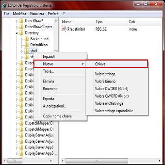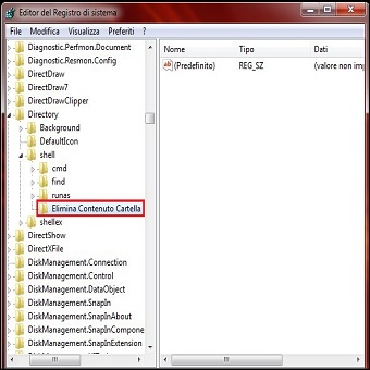 | 1. Premiamo contemporaneamente i tasti WINDOWS + R, digitiamo Regedit e portiamoci in HKEY_CLASSES_ROOT \ Directory \ Shell, clicchiamo col tasto destro sulla chiave Shell e creiamo una Nuova / Chiave assegnandogli il nome Elimina Contenuto Cartella. | ||