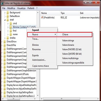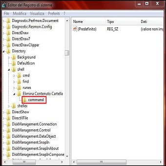 | 2. Clicchiamo col tasto destro su Elimina Contenuto Cartella e creiamo una Nuova / Chiave assegnandogli il nome Command. | ||