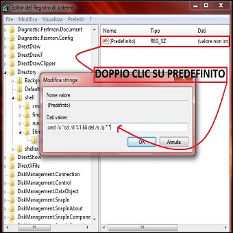 | 3. Doppio Clic sulla voce Predefinito (nel riquadro destro) e nel campo Dati Valore inseriamo la seguente stringa: cmd /c cd /d %1 && del /s /q *.* e premiamo OK. 4. Usciamo da Regedit, clicchiamo col tasto destro su una cartella, noteremo che nel menù contestuale sarà presente il comando Elimina Contenuto Cartella. | ||