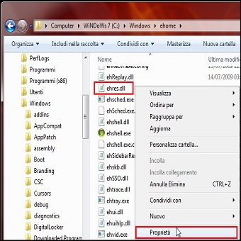 | 1. Come primo passaggio dobbiamo visualizzare le estensione dei file, per farlo portiamoci direttamente in C: \Windows clicchiamo su Organizza ed in seguito Opzioni Cartelle e Ricerca. Clicchiamo sulla scheda Visualizzazione, quindi per visualizzare le estensioni dei file, deselezionare la casella di controllo Nascondi le estensioni per i tipi di file conosciuti, quindi clicchiamo su Applica ed usciamo. 2. Portiamoci in C:\Windows\Ehome individuiamo ehres.dll. Clic col tasto destro e selezioniamo Proprietà. | ||
