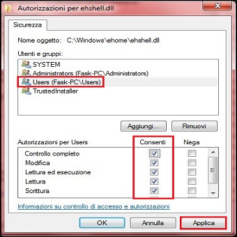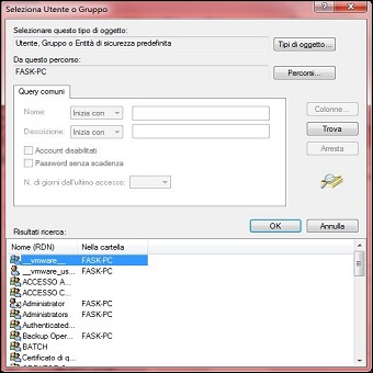 | 5. Nella finestra successiva clicchiamo su Altri Utenti e Gruppi/Avanzate/Trova e selezioniamo il nostro account utente quindi clicchiamo su OK per due volte seguito da Applica. Confermiamo il Messaggio di Sicurezza di Windows e di nuovo OK per due volte. 6. Ritorniamo nella scheda Sicurezza e clicchiamo sul pulsante Modifica. Nel riquadro Utenti e gruppi selezionate il nostro account e spuntiamo Consenti in corrispondenza della voce Controllo completo, confermando con OK. | ||