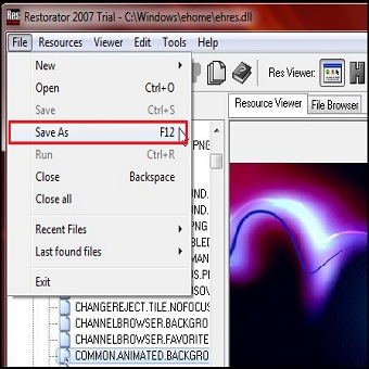| 11. Una volta caricata l’immagine personalizzata, nella parte destra di Restorator verrà visualizzata l’anteprima del nuovo sfondo di Windows media Center. 12. Terminata l’operazione portiamoci sulla barra degli strumenti di Restorator Resource Editor e clicchiamo su File/Save As e salviamo ehres.dll sul desktop. Portiamoci in C:\Windows\Ehome e rinominiamo ehres.dll in ehres.backup.dll. Tagliamo e copiamo ehres.dll personalizzato in C.\Windows\Ehome. | ||