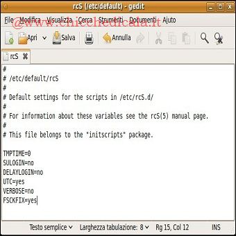 | 1. Se il sistema sta già eseguendo il desktop, apriamo un terminale e immettiamo il seguente comando: sudo gedit /etc/default/rcS 2. Automaticamente si aprirà il file in questione, ora modifichiamo la riga FSCKFIX come segue: FSCKFIX=yes salviamo il file; al successivo riavvio, fsck correggerà gli eventuali problemi del disco senza bisogno di intervenire. NOTA: Se state utilizzando un accesso basato sui caratteri, utilizzate il seguente comando: sudo nano /etc/default/rcS cambiate la riga FSCKFIX come sopra, quindi premete Ctrl+O e Ctrl+X per salvare e uscite. | ||