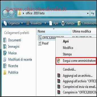 | 2. Il primo passo consiste nello scaricare l’archivio e scompattarlo in una cartella creata ad hoc. Si clicca con il tasto destro del mouse sul file Office2010Crack.bat selezionando Esegui come Amministratore3. Dal Prompt dei comandi si clicca INVIO attendendo il termine della procedura. A questo punto Office 2010 diventa definitivo senza limiti di tempo. | ||