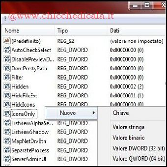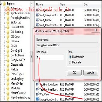 | 1. Premiamo contemporaneamente i tasti WINDOWS + R e digitiamo Regedit, nel caso venisse visualizzata la finestra di dialogo Controllo account utente, confermiamo l’azione cliccando su Sì e navighiamo alla seguente chiave: HKEY_CURRENT_USER\Software\Microsoft\Windows\CurrentVersion\Explorer\Advanced 2. A questo punto per aggiungere il comando Crittografa/Decrittografa, clicchiamo col tasto destro del mouse sulla parte destra del registro e selezioniamo Nuovo / Valore DWORD nominandolo: EncryptionContextMenu Una volta creato il valore clicchiamo con il tasto destro del mouse e assegniamo 1 nel campo Dati Valore, confermiamo le modifiche cliccando su OK. | ||