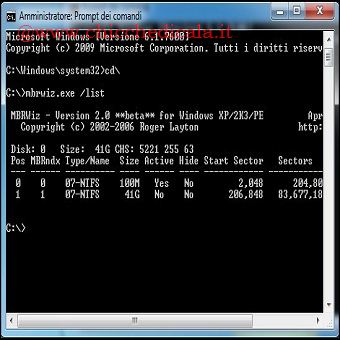 | 2. Clicchiamo con il tasto destro del mouse sul file MBRWiz.exe selezioniamo Proprietà, spostiamoci nella scheda Compatibilità e spuntiamo la casella Esegui il programma in modalità compatibile per: Windows XP (sp3), clicchiamo su Applica/OK. 3. Portiamoci in Start/Tutti i Progarmmi/Accessori ed apriamo come amministratori il prompt dei comandi. All’apertura scriviamo cd\\ e diamo INVIO. Per dare un occhiata alle partizioni disponibili sul nostro disco, con informazioni su grandezza, tipo (NTFS o FAT) ecc.. digitiamo mbrwiz.exe /list e premiamo INVIO. | ||