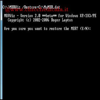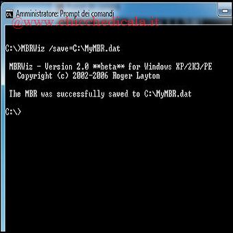 | 4. Per creare in C: una copia del nostro MBR usiamo il comando: MBRWiz /Save=C:\\MyMBR.dat seguito da INVIO. Custodiamolo con cura (anche su CD o Pen-Drive), Se avessimo bisogno di ripristinare il MBR, dal Prompt dei comandi (come amministratore) digitiamo: MBRWiz /Restore=C:\\MyMBR.dat, premendo Y alla richiesta di conferma. | ||