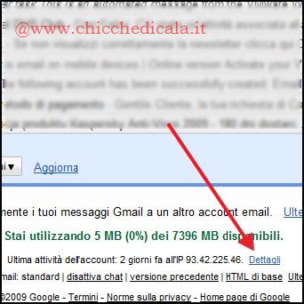 | 1. Per verificare gli ultimi accessi effettuati sul nostro account di posta GMail, entriamo nella pagina principale del servizio e clicchiamo sul link Dettagli che si trova in basso. La finestra Attività di questo Account mostra il tipo di accesso che è stato effettuato, con quale IP (se è diverso dal nostro preoccupiamoci) e la data con l’ora. | ||