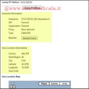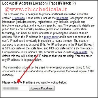 | 4. Ora che conosciamo l’IP di coloro che hanno effettuato l’accesso (passaggio 1), possiamo risalire, anche se non con assoluta precisione, al computer di chi è entrato nella nostra casella di posta elettronica. Andiamo ad esempio sul sito Whatismyipaddress.com e clicchiamo sull’opzione IP Lookup. Inseriamo l’IP incriminato nel campo please enter the IP address you want to lookup below e clicchiamo il pulsante Lookup IP address. Saranno quindi, mostrate alcune informazioni come il provider e la posizione sulla mappa. | ||