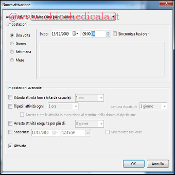 | 9. Ora spostiamoci nella scheda Attivazione e, se presente, evidenziamo la prima voce / Modifica, diversamente selezioniamo Nuovo posticipando la data di un giorno mentre l’orario alle ore 09:00. Confermare l’azione cliccando OK. NOTA: Per visualizzare i vecchi calendari probabilmente sarà necessario uscire e rientrare. | ||