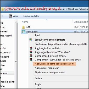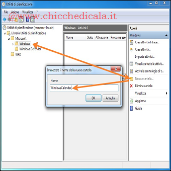 | 5. Per aggiungere questi file in Windows 7, copiamo la cartella WindowsCalendar allo stesso percorso, ovvero in C: \Windows\ Programmi. A questo punto, per accedere facilmente al calendario, clicchiamo col tasto destro del mouse sul file Wincal.exe e dal menu a tendina selezioniamo Aggiungi alla Barra delle Applicazioni o se preferite al Menu Start. 6. Portiamoci nel pannello di controllo, apriamo Strumenti di amministrazione e selezioniamo Utilità di pianificazione, aprendo l’albero Windows noteremo che la cartella WindowsCalendar non è presente. Per bypassare questo problema evidenziamo la cartella Windows e dalla sezione Azioni selezioniamo Nuova Cartella. Nel campo di ricerca immettiamo WindowsCalendar (senza spazi tra le parole) e confermiamo l’azione cliccando OK. | ||