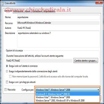 | 7. Ora selezioniamo la cartella WindowsCalender presente nell’albero Windows e, focalizzando la nostra attenzione nella sezione Azioni, selezioniamo Importa Attività, scegliendo il file XML creato o scaricato in precedenza. 8. Visualizzeremo la finestra di dialogo Crea Attività. Dalla scheda Generale mofichiamo la sezione Configura per: selezionando Windows 7, Windows Server 2008 R2′. | ||