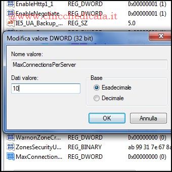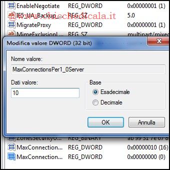 | Secondo gli standard del settore, è consentito di scaricare da qualsiasi server solo due file alla volta. Per impostazione predefinita se si visita una pagina web con tante immagini (e file di supporto, come gli stili CSS e Javascript), allora si può avere un’esperienza di navigazione più lenta. In media, il browser deve effettuare più di 40 richieste al server prima di poter assemblare la pagina completa. È possibile accelerare questo processo aggiungendo due chiavi di Registro di sistema. 3. Apriamo il Menu Start e clicchiamo su Esegui, oppure utilizziamo la combinazione di tasti Windows + R e nella casella Esegui digitiamo regedit seguito da Invio e navighiamo alla chiave: HKEY_CURRENT_USER\Software\Microsoft\Windows\CurrentVersion\Internet Settings Creiamo uma nuova chiave DWORD (32-bit) nominandola MaxConnectionsPerServer, Modificando i Dati Valore (Esadecimale) con un numero superiore a 2 (io uso 10/15). 4. Creiamo una nuova chiave DWORD (32-bit) denominato MaxConnectionsPer1_0Server e Modifichiamo questa chiave impostostando il valore Esadecimale uguale alla chiave MaxConnectionsPerServer. Usciamo da registro e riavviamo il PC. NOTA: Per annullare il Tweak basterà eliminare le due chiavi. | ||