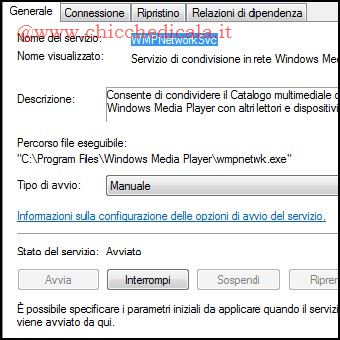 | 1. Apriamo il Menu Start e clicchiamo su Esegui, oppure utilizziamo la combinazione di tasti Windows + R e nella casella Esegui digitiamo services.msc seguito da Invio. Individuato il servizio di condivisione in rete Windows media player. Con un doppio clic apriamo la finestra delle proprietà. 2. Terminiamo il servizio cliccando sul pulsante Interrompi e confermiamo con OK. | ||