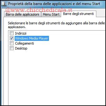 | 5-6. Avviamo Windows Media Player e minimizziamo a icona la finestra del programma. Clicchiamo col tasto destro sulla barra delle applicazione e selezioniamo Proprietà, spostiamoci nel menu Barra degli Strumenti, spuntiamo la casella Windows Media Player e confermiamo con Applica / OK. A questo punto possiamo goderci la buona e vecchia Toolbar. NOTA: Riavviare il servizio terminato al passo2. | ||