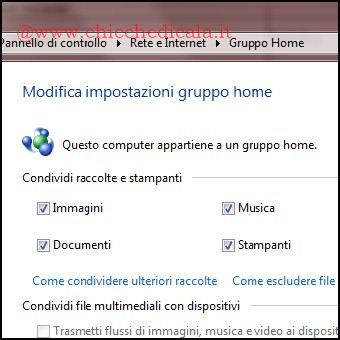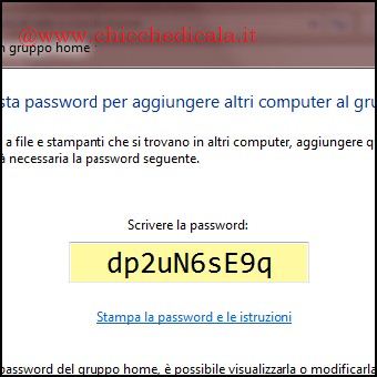 | 1. Portiamoci in Start / Pannello di Controllo / Reti e Internet / Gruppo Home, Nella pagina Condividi con altri computer di casa che eseguono Windows 7 clicchiamo su Crea un Gruppo Home. Nella finestra di dialogo successiva, nella sezione Condividi Raccolte e Stampanti mettiamo un segno di spunta sulle opzioni desiderate e proseguiamo. 2. La funzionalità Gruppo Home inizialmente fornisce una password, ma possiamo cambiarla all’istante o in qualsiasi momento \t\tselezionando Cambia Password (nella finestra Gruppo Home). Al termine salviamo le modifiche cliccando Fine. Aprendo Esplora Risorse nel riquadro di spostamento noteremo la voce aggiunta Gruppo Home, ora sarà necessario aggiungervi altri computer in modo da poter accedere a raccolte e stampanti condivise. | ||||||||||||||||||||||||||||||||||