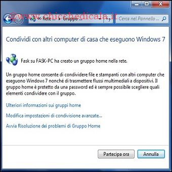 | 3. Ricordiamoci di eseguire la procedura seguente in ogni computer da aggiungere al Gruppo Home, detto questo, portiamoci in Start / Pannello di Controllo / Reti e Internet, selezioniamo Scegli Gruppo Home e Opzioni di Condivisionee clicchiamo su Partecipa Ora. 4. Nella finestra successiva digitiamo la password scelta precedentemente. Effettuato l’accesso saremo in grado accedere ai relativi file e risorse condivise. | ||||||||||||||||||||||||||||||||||