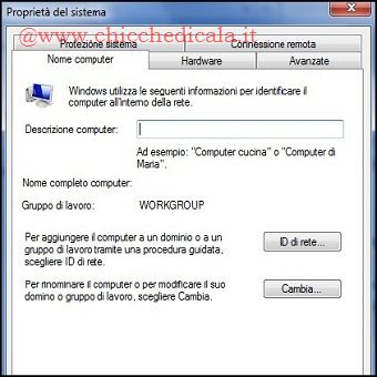 | 6. Apriamo il Pannello di controllo / Sistema e Sicurezza e clicchiamo su Sistema, In alternativa per richiamare la finestra desiderata possiamo utilizzare la combinazione di tasti Windows + Pausa. A questo punto selezioniamo Cambia Impostazioni Computer e dalla scheda Nome Computer clicchiamo il pulsante Cambia. 7. Inseriamo un nome in Gruppo di lavoro, che dovrà essere uguale per entrambi i computer, e riavviamo il computer. (prosegui l’articolo Vedi impaginazione sotto) | ||||||||||||||||||||||||||||||||||