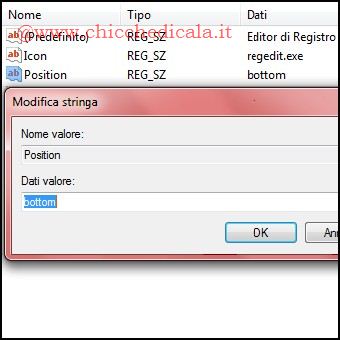 | 5. Per spostare il nuovo comando verso la parte inferiore del menu contestuale creiamo una Nuova / Valore Stringa, nominandola Position. Modifichiamo i Dati Valore digitando Bottom. 6. A questo punto aprendo il menu contestuale noteremo il nuovo comando nella parte inferiore e con la rispettiva icona. | ||