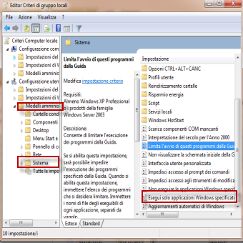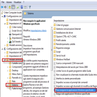| 1. Portarsi sul menu start di Windows e cliccare Esegui. Scrivere gpedit.msc e dare Invio. | 2. Portarsi su Configurazione Utente/Modelli amministrativi/Sistema . Doppio clic sulla voce Non eseguire le applicazioni di Windows Specificate. | |