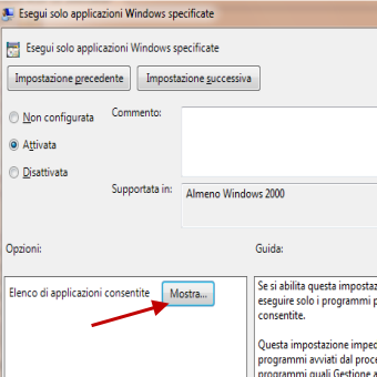 | 5. Portarsi su Configurazione Utente/Modelli amministrativi/Sistema . Doppio clic sulla voce Esegui solo applicazioni di Windows Specificate. | 6. Cliccare Attivata , Mostra e dal menu scrivere il nome dei programmi che si vuole consentire (quelli non indicati non verranno eseguiti) . | |