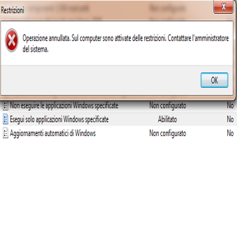| 7. Ad esempio se si indicano tre programmi in questa finestra, questo significa che solo questi potranno essere eseguiti , gli altri automaticamente verranno bloccati | 8. Una volta effettuate le operazioni descritte , se un utente del pc tenta di eseguire applicazioni diverse da quelle indicate viene automaticamente bloccato. | |