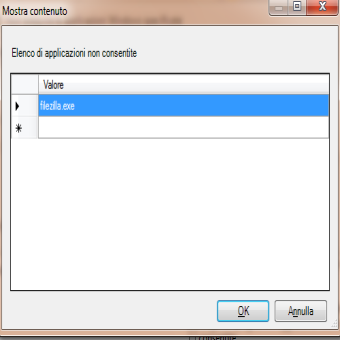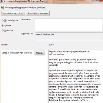 | 3. Cliccare Attivata , Mostra e dal menu scrivere il nome del programma che si vuole bloccare . | 4. Ad esempio se indico il programma filezilla.exe , questo programma non sarà più eseguibile nel PC ricevendo un messaggio di errore (come indicato al punto 8). | |
