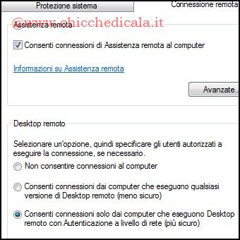 | 1. Apriamo il menu Start, clicchiamo col tasto destro su Computer e scegliamo Proprietà, in alternativa utilizziamo la combinazione di tasti Windows + Pausa per aprire la finestra proprietà di sistema, quindi, clicchiamo su Impostazioni di connessione remota. Se viene chiesto di fornire una password amministratore o una conferma, digitiamo la password o confermiamo. 2. In Desktop remoto selezioniamo una delle tre opzioni disponibili: