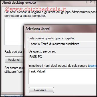 3. clicchiamo su Seleziona utenti (Se si è un amministratore del computer, l’account utente corrente verrà automaticamente aggiunto all’elenco degli utenti remoti e sarà possibile ignorare i due passaggi successivi), quindi nella finestra di dialogo Utenti desktop remoto clicchiamo su Aggiungi. Nella finestra di dialogo per la selezione di utenti o gruppi eseguiamo le operazioni seguenti: