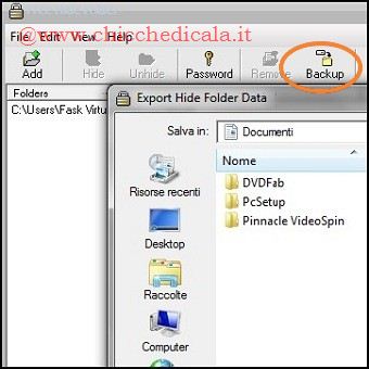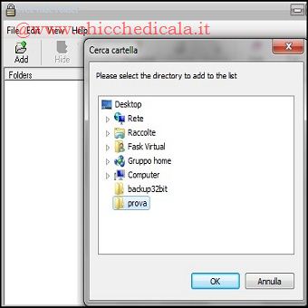 | 3. Siete pronti per cominciare. Selezionate le cartelle, da aggiungere alla lista degli elementi da nascondere. Occorre ripetere la stessa operazione più volte, per diversi elementi, visto che il programma non consente selezioni multiple. 4. Prima di avviare la procedura di “oscuramento”, conviene creare una copia di backup dei file e delle cartelle. Premete “Backup” e selezionate gli elementi desiderati. | ||