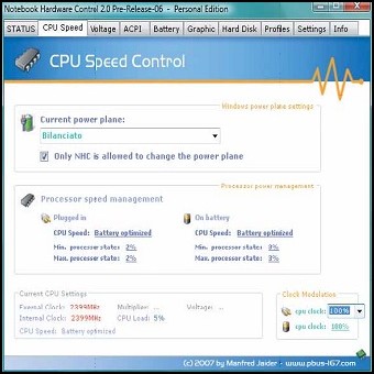 | 1. Scaricate e installate il programma. Nella schermata iniziale sono evidenziati i parametri vitali del sistema, come RAM disponibile, temperatura della CPU e delle memorie di massa, carico sul processore. Tutto in tempo reale. 2. La finestra precedente mostra, in basso a destra, un pulsante verde. Se lo premete, gli stessi parametri verranno visualizzati in trasparenza, sul desktop. Fate clic su CPU speed per accedere all’ambiente destinato a regolare prestazioni e richieste della CPU. In alto, nel menu a discesa, avete la possibilità di scegliere come gestire le risorse dell’alimentazione. I più esperti possono intervenire sui parametri di gestione, scegliendo i valori delle prestazioni della CPU e della batteria. | ||