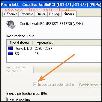 | Dalla maschera di Gestione Periferiche ho notato che la scheda audio è disattiva perché in conflitto con altri dispositivi. Come faccio ad eliminare il conflitto fra una periferica e la scheda audio ? Un conflitto ha luogo quando due periferiche hardware cercano di utilizzare un bus (una sorta di canale di comunicazione per lo scambio di dati) o un interrupt identico. Si tratta di risorse della scheda madre che non possono essere condivise e Windows, in questi casi, in modo del tutto arbitrario, disattiva una delle due periferiche in conflitto in modo da regolarizzare l’accesso alle risorse. La presenza del conflitto è evidenziata da un punto esclamativo giallo nella maschera di Gestione Periferiche / Dispositivi del sistema e maggiori informazioni si possono ottenere cliccando sul pulsante Proprietà della scheda audio. Se le impostazioni delle risorse del dispositivo risulteranno in conflitto, nella finestra di dialogo verrà visualizzata la scheda Risorse (immagine 3) diversamente non verrà visualizzata (immagine 4). Per provare a risolvere manualmente un conflitto bisogna innanzitutto togliere il segno di spunta dalla casella Usa impostazioni \t\tautomatiche e quindi procedere con Cambia impostazioni, selezionando una delle voci di risorsa elencate (Livello di interrupt, Intervallo I/O, DMA, ecc.) e variando i valori fino a quando non viene visualizzata la voce Nessun conflitto. Il conflitto più comune che capita su alcuni PC è quello fra la scheda audio normale (quella montata sul connettore PCI) e la scheda audio “on-board”, cioè quella integrata sulla piastra madre. Alcune motherboard infatti (specie quelle col chipset VIA), dispongono di un controller audio integrato sulla piastra, che deve essere manualmente disattivato dalle opzioni del BIOS, altrimenti vedremo la presenza di una “doppia” scheda audio con i relativi conflitti sul proprio sistema. | ||
